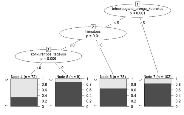 Protsessiuuendusi mõjutab kõige enam tehnoloogilise arengu keerukuse ja ettenägematuse tajumine. Ligikaudu 80% protsessiuuendusi teinud ettevõtetest nõustuvad, et tehnoloogiline areng on keerukas ja raskesti prognoositav (Joonis 5). See viitab sellele, et tehnoloogiline ebakindlus toimib olulise protsessiuuenduste ajendina, sundides ettevõtteid oma tööprotsesse pidevalt kohandama. Ettevõtete seas, kes ei taju tehnoloogiate arengut keerukana, osutub järgmiseks määravaks teguriks hinnatõusuga seotud surve. Need ettevõtted arvestavad protsessiuuenduste tegemisel pigem hinnatõusu ohuga, mis osutab kulusurve ja hinnakonkurentsi rollile protsesside tõhustamisel. Juhul kui ettevõtted ei taju ei tehnoloogilist keerukust ega hinnasurvet, ilmneb protsessiuuenduste tegemine peamiselt nende seas, kes kogevad tugevat konkurentide survet. See näitab, et konkurentsiolukorra pingestumine võib asendada teisi ajendeid ning sundida ettevõtteid protsesse ümber korraldama ka stabiilsema keskkonna tingimustes. Ettevõtted, kes ei taju märkimisväärselt ei tehnoloogilist ebakindlust, hinnasurvet ega konkurentide survet, tegelevad protsessiuuendustega oluliselt harvem, mis viitab protsessiuuenduste pigem reaktiivsele kui proaktiivsele iseloomule. Seega näitab analüüs, et protsessiuuendused kujunevad mitme keskkonnateguri koosmõjus, kus keskset rolli mängivad tehnoloogilise arengu ettenägematus, sellele järgnevalt hinnasurve ning teatud tingimustel ka konkurentsisurve. See viitab, et protsessiuuendused ei ole ettevõtete jaoks juhuslikud tegevused, vaid strateegilised vastused tajutud keskkonna ebastabiilsusele.